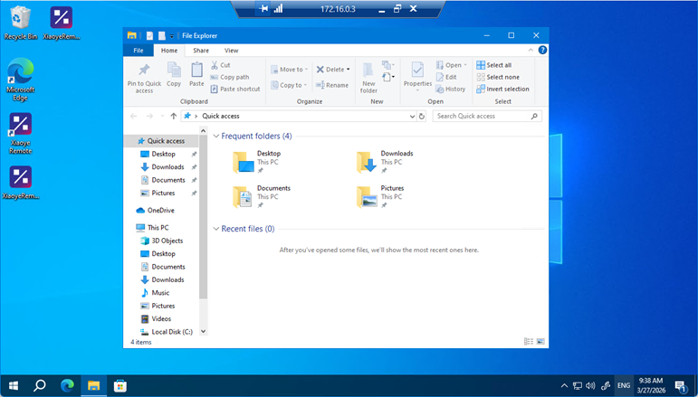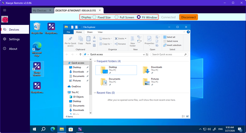 No matter how large or small you drag the window, the remote desktop content scales proportionally to fill it. This is achieved through interpolation algorithms: when the window grows, the content is “stretched”; when it shrinks, the content is “compressed”. As a result, the display always fits the window, but text edges become less sharp, and icon details degrade slightly. On a 4K screen, shrinking a remote window can make text difficult to read.