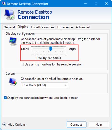 After connecting, the window itself has a maximum size limit—you cannot drag it beyond the pre‑set resolution