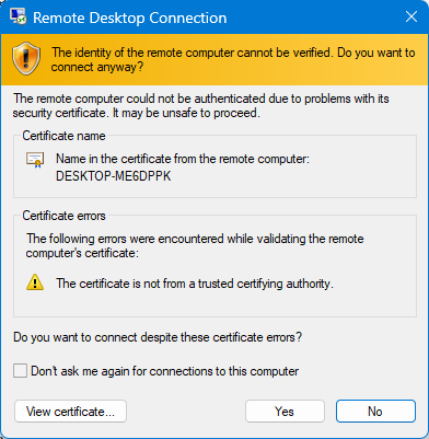 Method 1: Check "Don't ask me again for connections to this computer" to bypass warning in future connections Method 2: Import the certificate to local root certificate store (requires connecting using the host computer name, not IP address)