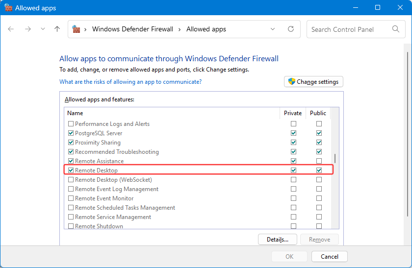 Scroll down to Remote Desktop and ensure it's allowed. For personal computers, this is typically configured automatically when enabling Remote Desktop.