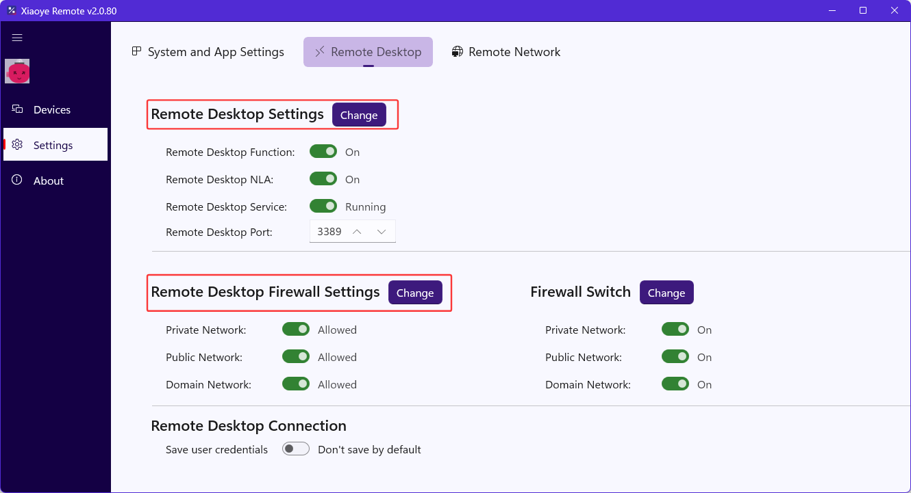 If you find these steps complicated, you can try "Xiaoye Remote Control": Just go to Settings → Remote Desktop on the host computer and ensure both "Remote Desktop Settings" and "Remote Desktop Firewall Settings" are enabled and allowed. Usually, that's all you need.