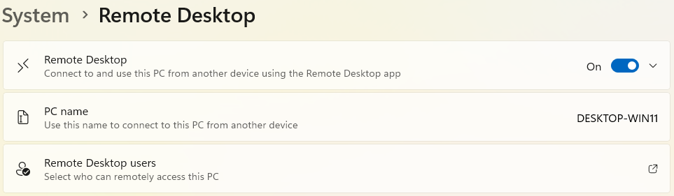 Open Windows Settings (Shortcut: Win + I) → Navigate to "System → Remote Desktop"![]()