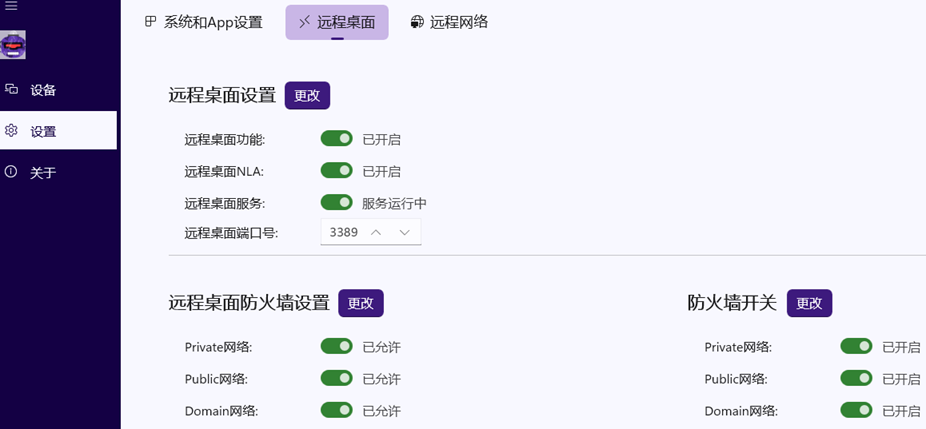 - 进入设置->远程桌面,查看两端的各项服务或设置是否正常,如果不正常需要进行更改;