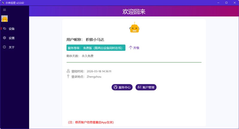 我们很高兴地宣布,小烨远控2.0.82版本正式发布! 本次更新带来了一个极具诚意的政策:两台设备,永久免费。无论您是为家庭电脑提供技术支持,还是需要在两个办公地点间无缝切换,这个免费版本足以覆盖大多数个人用户的日常需求。