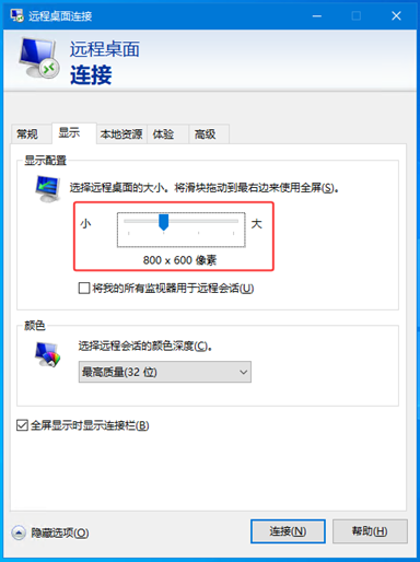 - 当你用固定分辨率模式连接远程桌面后,窗口本身是有最大尺寸限制的——你不能把它拖到超过预设分辨率的尺寸。
