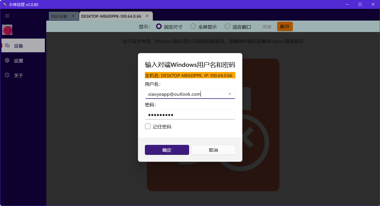 小烨远控同样支持使用Microsoft账户访问远程桌面,前提是您的Windows远程桌面已经满足前置条件,参考第二章节说明;